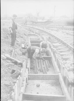 - Scope and ContentShows cable troughs being laid in trench beside railway tracks in open country (from old print).