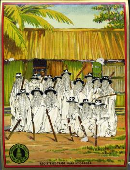 - Scope and ContentColoured shipper's ticket showing people wearing veiled costumes with black hats and staffs, in front of a village hut. Bears the stamp of Spruce manufacturing Co. Ltd.