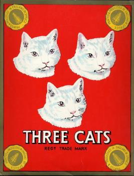 - Scope and ContentColoured shipper's ticket showing three white cat heads on red background with the text 'Three Cats, Regd Trade Mark'. Bears the stamp of Spruce Manufacturing Co. Ltd. in each corner.