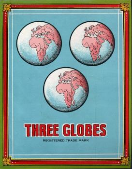 - Scope and ContentColoured shipper's ticket showing three globes, focused on Africa. Unidentified maker. Text reads 'Three Globes, Registered Trade Mark'.