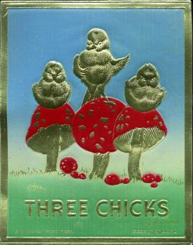 - Scope and ContentColoured and gold embossed shipper's ticket with three gold embossed chicks each sat on a red and gold embossed toadstool. Text reads 'Three Chicks. Registered Trade Mark. Made in England.'