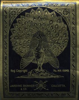 - Scope and ContentMonochrome/ gold embossed shipper's ticket, showing a peacock and flowered border. Text reads 'Jardine Skinner & Co. Calcutta, Reg. Copyright No. MR 10943.'