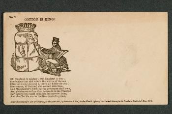 - Scope and ContentOne envelope, published by Stimpson & Co in New York in 1861, at the start of the American Civil War. Both the northern Union and southern Confederate states published illustrated envelopes from the 1850s, as political propaganda to sway support in their favour. In the Union states, slavery was a common theme as they sought to abolish it, whereas the Confederates wanted it preserved. Over 4,100 different envelope designs were produced, with versions published in most of the major cities, New York and Boston being the most prolific. The envelope includes a verse, entitled 'Cotton is King!', and uses patriotic images to reinforce the poem. John Bull, the stereotypical Briton, is showing respect to a cotton bale whilst kneeling on a slave, a clear indication of his alleged priorities. John Bull also carries a paper with the word Manchester printed on it in his pocket. American cotton grown by enslaved Africans was vital to Lancashire's cotton industry and the national economy, but many workers supported the abolition movement. During the Civil War, Union forces blockaded southern ports, preventing the export of raw slave-grown cotton. This action led to the "Lancashire cotton famine" of 1862-1863. Despite the effect on the local economy, many people in Manchester continued to support Abraham Lincoln and the Union states in the fight against slavery.