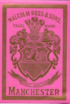 - Scope and ContentMonochrome shipper's ticket showing a coat of arms comprising of a lion and a knight's helmet, and the slogan 'Vincit Veritas'. Gold print on pink background. Text reads 'Malcolm Ross & Sons, Trade Mark, Manchester.'