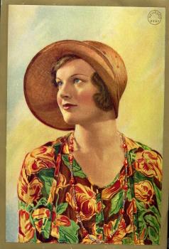 - Scope and ContentColoured shipper's ticket, showing a woman wearing 1920s style cloche hat, flowered dress and necklace. Nehesco stamp in top corner.
