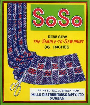 - Scope and ContentColoured shipper's ticket, showing hanging blue patterned fabric being cut with scissors, on a yellow background, with the slogan 'So-So'. Text reads 'Sew-Sew. The simple-to-sew print. 36 inches. Printed Exclusively for Mills Distributors S.A. (PTY) Ltd. Durban.'