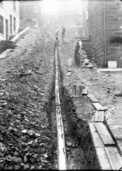 Shows cable laid in troughing up middle of street up hill, man with pitch bucket near top.