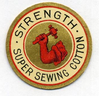 - Scope and ContentSmall circular, coloured shipper's ticket, showing a man's arm wielding a hammer, with the slogan 'Super Strength Sewing Cotton'.