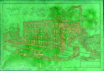- Scope and ContentMonochrome shipper's ticket, showing a mill with horse and carts and workers. Green background with gold print. Maker unidentified, but the same image is shown on another shipper's ticket by The Bombay Co. Ltd.