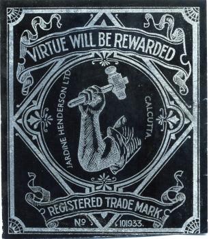 - Scope and ContentColoured shipper's tickets, showing a man's arm wielding a hammer, with the slogan 'Virtue will be rewarded'. Text reads 'Jardine Henderson Ltd, Calcutta. Registered Trade Mark No. 101933'. Black with silver print.