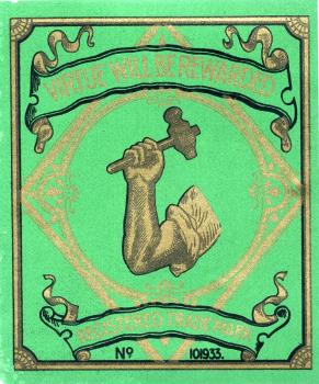 - Scope and ContentColoured shipper's tickets, showing a man's arm wielding a hammer, with the slogan 'Virtue will be rewarded'. Text reads 'Jardine Henderson Ltd, Calcutta. Registered Trade Mark No. 101933'. Green with gold print.