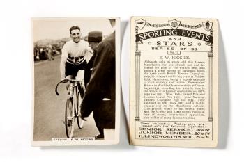- Scope and ContentSeries of cigarette cards containing photographic portraits of sports personalities and events, including: No.15 Belle Vue Speedway Team; No.73 E. W. Higgins (Cyclist); No.88 J. E. Sibbit (Cyclist).
